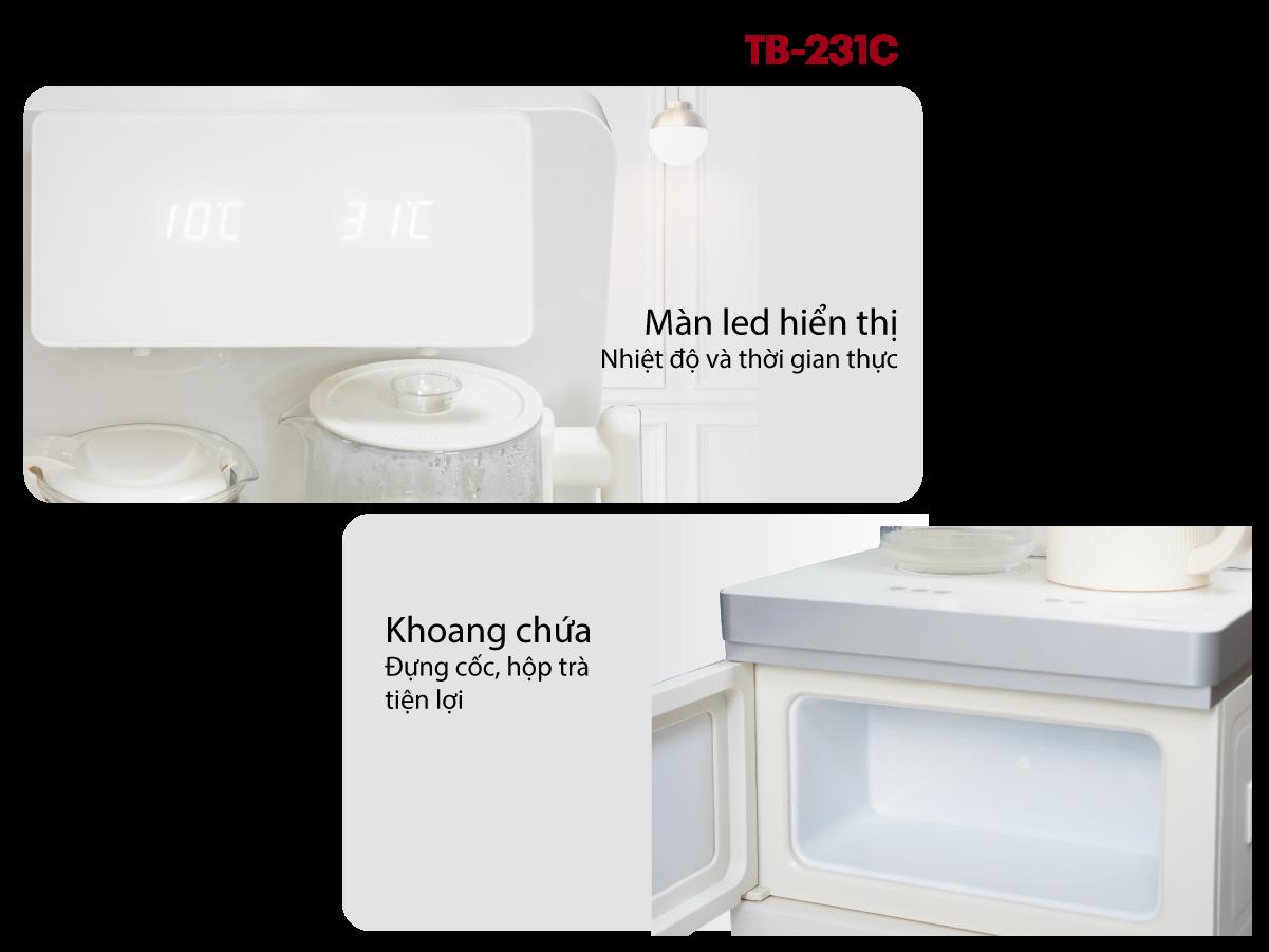 Cây nước nóng lạnh kết hợp bàn pha trà, cafe Fujihome TB -231C, làm lạnh bằng công nghệ block làm lạnh nhanh, sâu cho nhiệt độ nước lạnh 5 - 10 độ C. Thiết kế bình âm thuận tiện cho mỗi lần thay bình, dễ dàng cho cả phụ nữ và người già, kết hợp bàn trà kèm bình đun nước siêu tốc, đun nhanh trong vòng 60s, tiết kiệm điện.