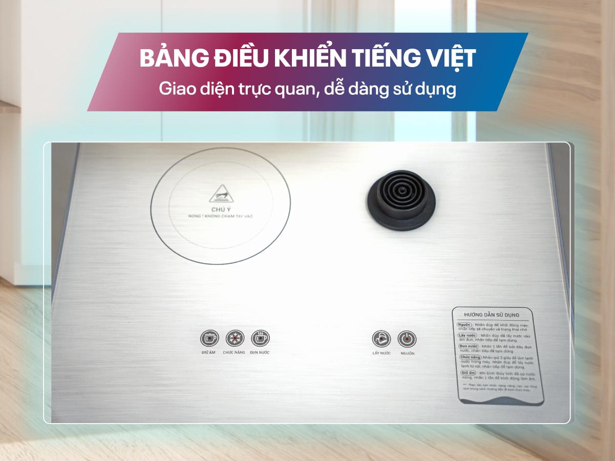 Màn hình điều khiển cảm ứng một chạm thao tác dễ dàng . Bảng hiển thị nhiệt độ phía trên to , rõ có thể theo dõi được nhiệt độ nóng , lạnh của cây nước. Thiết kế hoàn hảo , ấn tượng, phù hợp với mọi không gian : phòng tiếp khách, phòng họp, dùng cho văn phòng cũng như gia đình với kiểu dáng hoàn toàn mới, sang trọng, hiện đại, đảm bảo vệ sinh, thân thiện môi trường. Kiểu dáng to đẹp, chắc chắn với khung sườn bằng kim loại, ngay bên dưới là ngăn chứa đồ rộng , có điều khiển từ xa và hướng dẫn sử dụng tiếng Việt in ngay trên bề mặt máy