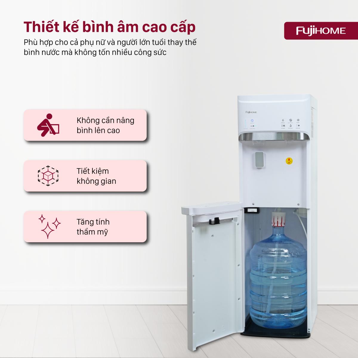 Fujihome WD628C-IM có thiết kế nhỏ gọn, màu trắng sang trọng, giúp tô điểm không gian nội thất hiện đại. Kiểu dáng bình âm giúp việc thay nước dễ dàng, giảm thiểu nguy cơ tràn nước. Khay hứng nước thừa giúp ngăn chảy nước xuống sàn, dễ dàng vệ sinh.