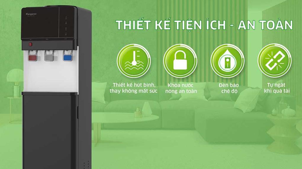 - Cây nước nóng lạnh Kangaroo thiết kế màu đen sang trọng, kiểu dáng thon gọn, hiện đại, dùng đẹp trong cả không gian kiến trúc gia đình, văn phòng, nhà hàng, khách sạn, khu du lịch,...