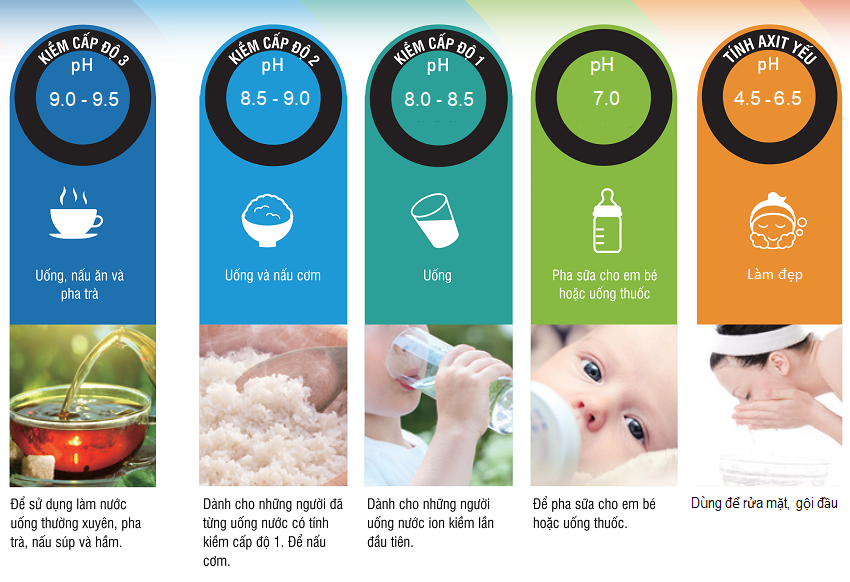 Nước iON kiềm cấp độ 3 pH ~ 9.0 - 9.5: Nước uống, pha trà, nấu súp và hầm.