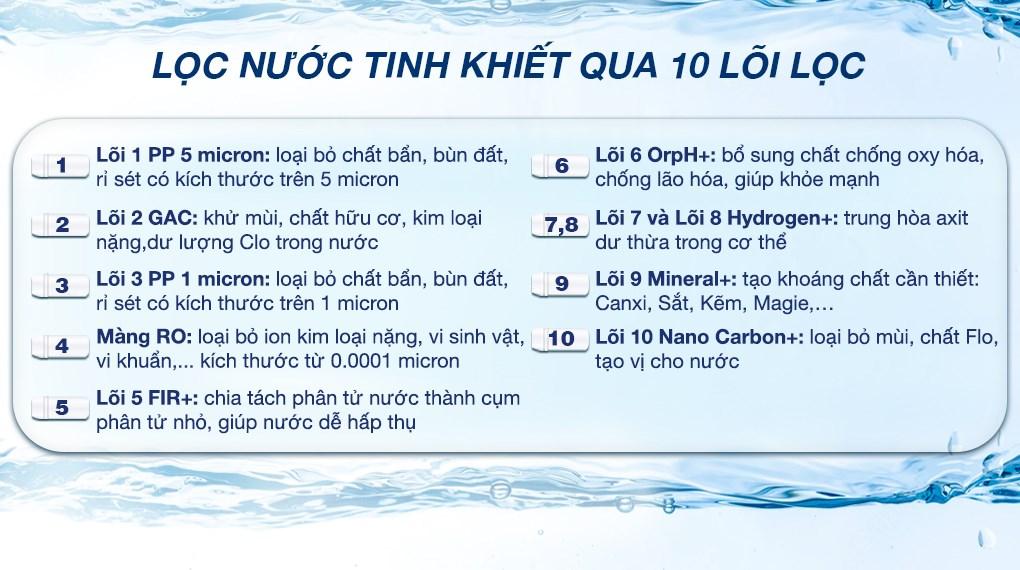 - Lõi 10 Nano Carbon+: loại bỏ mùi, chất Flo, tạo vị cho nước, ngăn chặn sự phát triển của vi khuẩn.