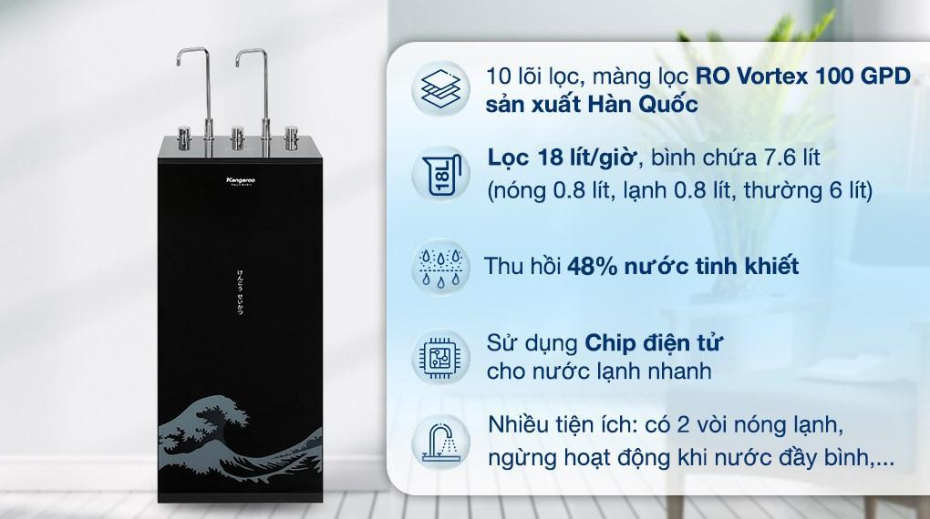 Máy lọc nước Kangaroo Hydrogen nóng lạnh KG10A12 sở hữu 10 lõi lọc, 3 chế độ nước nóng - nguội - lạnh, màng lọc RO Vortex 100 GPD xuất xứ Hàn Quốc cho công suất lọc lớn, tạo nước Hydrogen chống oxy hóa, thương hiệu Kangaroo - Việt Nam.