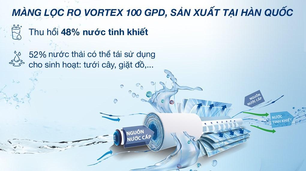 - Mẫu máy lọc nước RO này có tỷ lệ lọc - thải là 4.8/5.2. Đồng nghĩa nếu có 10 lít nước đưa vào máy sẽ lọc được 4.8 lít nước tinh khiết để uống và 5.2 lít được thải ra ngoài.