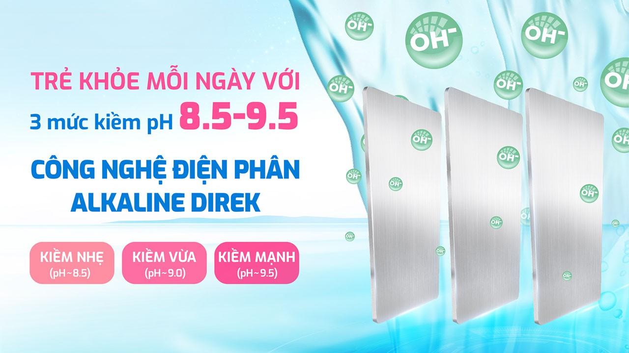 Công nghệ Alkaline Direk với 3 tấm điện cực Titan phủ Bạch Kim cấu tạo dạng phẳng, giúp diện tích tiếp xúc với nước lớn, làm tăng hiệu suất điện phân, chỉ số Hydrogen lên tới 1300 ppb, đồng thời chỉ số ORV đạt tơi -300mV, tăng độ rộng của dải pH.