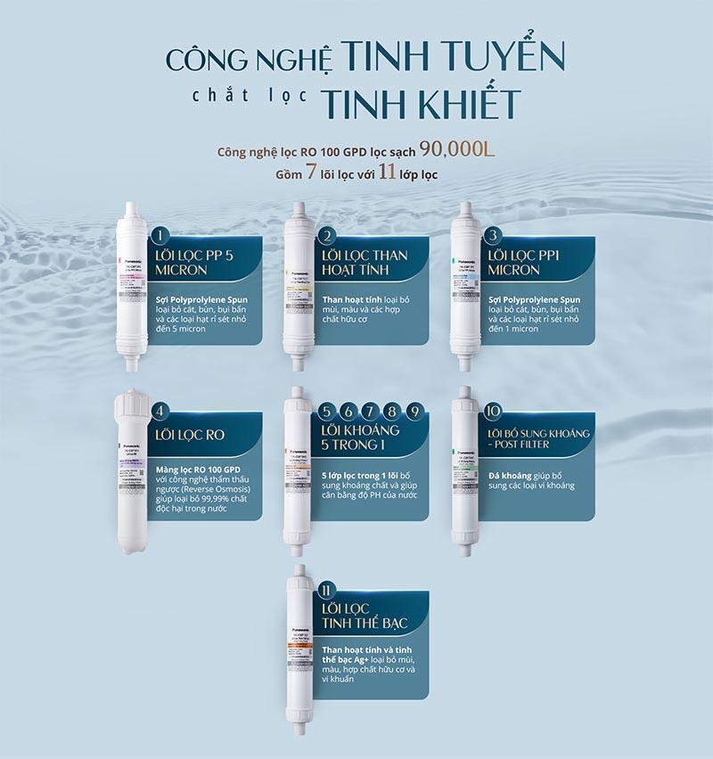 - Lõi 7: Tinh thể bạc, loại bỏ mùi, màu, hợp chất hữu cơ và vi khuẩn.