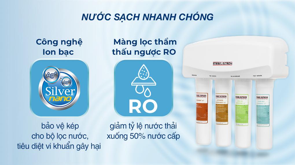 Máy lọc nước RO Stiebel Eltron Glacier 4 lõi sử dụng công nghệ kháng khuẩn Ion bạc, công suất lọc 18 lít/giờ, trang bị nhiều tiện ích hữu dụng, lõi RO sản xuất tại Hàn Quốc đảm bảo chất lượng.