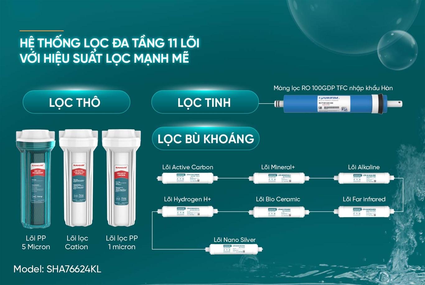 Máy lọc nước RO UltraPURE SUNHOUSE 11 lõi SHA76624KL gồm 11 lõi với các công dụng khác nhau, được chia làm 3 lọc gồm: cấp lọc thô, cấp lọc tinh và cấp lọc bù khoáng. Trong đó: