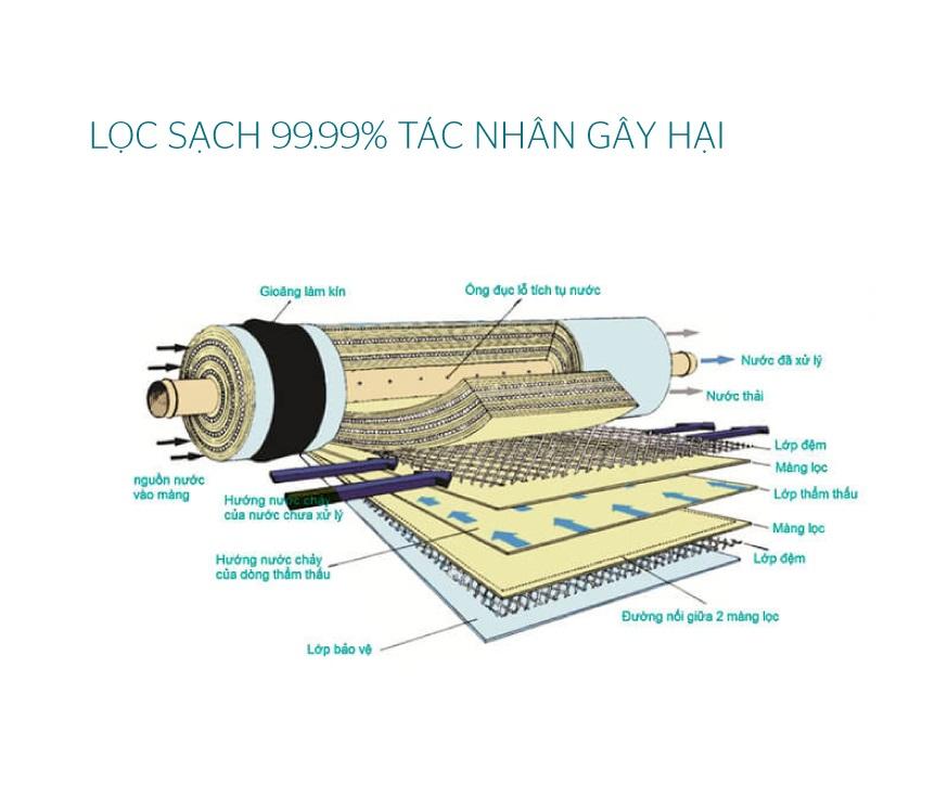 Màng lọc thẩm thấu ngược R.O: Loại bỏ hoàn toàn tạp chất, ion kim loại nặng, vi khuẩn, các chất hữu cơ, …