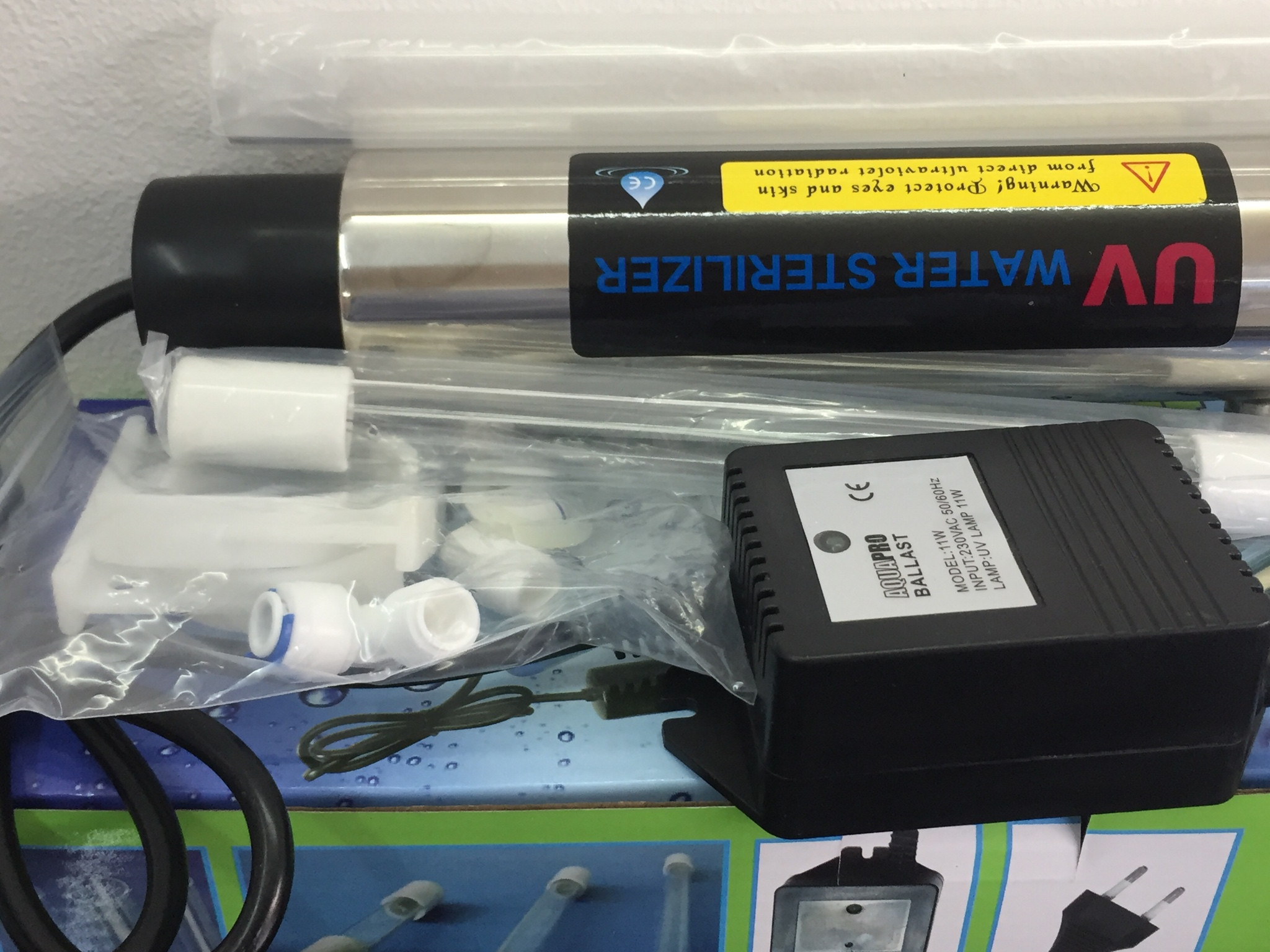 Sản phẩm bao gồm: 01 đèn UV, 01 adaptor, 01 bóng đèn, 01 vỏ thạch anh, các co cút đính kèm.