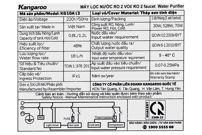 - Máy lọc nước này có công suất lọc 18 lít/giờ.