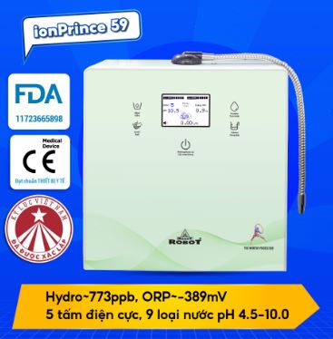 Máy lọc nước điện giải iON kiềm ROBOT IONPRINCE 59 có khả năng tạo ra đến 9 loại nước đa chức năng, với 5 mức nước iON kiềm (pH 8.5 – 10.5), nước lọc trung tính (pH 7.0) & 3 mức nước iON axit (pH 4.5 - 5.5) có thể điều chỉnh, thay đổi tùy theo đặc tính nguồn nước tại nơi lắp đặt. Với nồng độ oxy hóa (ORP) lên đến -389 mV (***), nồng độ Hydro trong nước lên đến 773 ppb (***) đáp ứng mọi nhu cầu sử dụng trong cuộc sống.