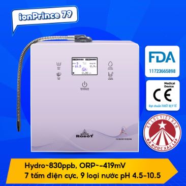 Máy lọc nước điện giải iON kiềm ROBOT IONPRINCE 79 có khả năng tạo ra đến 9 loại nước đa chức năng, với 5 mức nước iON kiềm (pH 8.5 – 10.5), nước lọc trung tính (pH 7.0) & 3 mức nước iON axit (pH 4.5 - 5.5) có thể điều chỉnh, thay đổi tùy theo đặc tính nguồn nước tại nơi lắp đặt. Với nồng độ oxy hóa (ORP) lên đến -419 mV (***), nồng độ Hydro trong nước lên đến 830 ppb (***) đáp ứng mọi nhu cầu sử dụng trong cuộc sống.