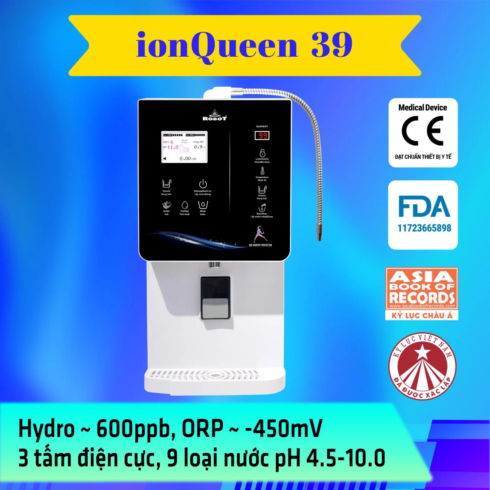 Máy lọc nước điện giải iON kiềm ROBOT ionQueen 39 được sản xuất với công nghệ tiên tiến hàng đầu thế giới, trang bị 3 tấm điện cực, tạo ra nhiều mức nước pH với chỉ số Hydrogen & ORP đạt tối ưu & tích hợp đầy đủ chức năng ưu việt. Ứng dụng công nghệ điện phân tiên tiến Korea, là dòng máy điện giải có khả năng tạo ra đến 9 loại nước đa chức năng, với 4 mức nước iON kiềm (pH 8.5 – 10.0), nước lọc trung tính (pH 7.0) Nguội – Nóng – Lạnh & 2 mức nước iON axit (pH 4.5 - 5.5). Chất lượng nước đạt chỉ số tối ưu, nồng độ Hydro hoạt tính lên đến ~ 600 ppb, chống oxy hóa (ORP) lên đến ~ -350 mV đáp ứng mọi nhu cầu sử dụng trong cuộc sống.