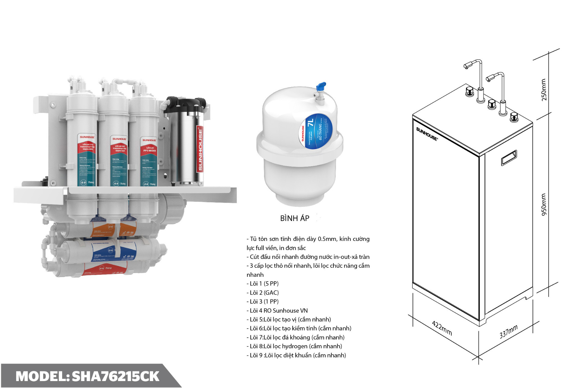Máy lọc nước SHA76215CK sở hữu bộ lọc 9 lõi, không chỉ lọc sạch nước mà còn bổ sung các khoáng chất hữu ích cho cơ thể. Sản phẩm gồm 3 cấp lọc chính bao gồm lọc thô, lọc tinh và bù khoáng.